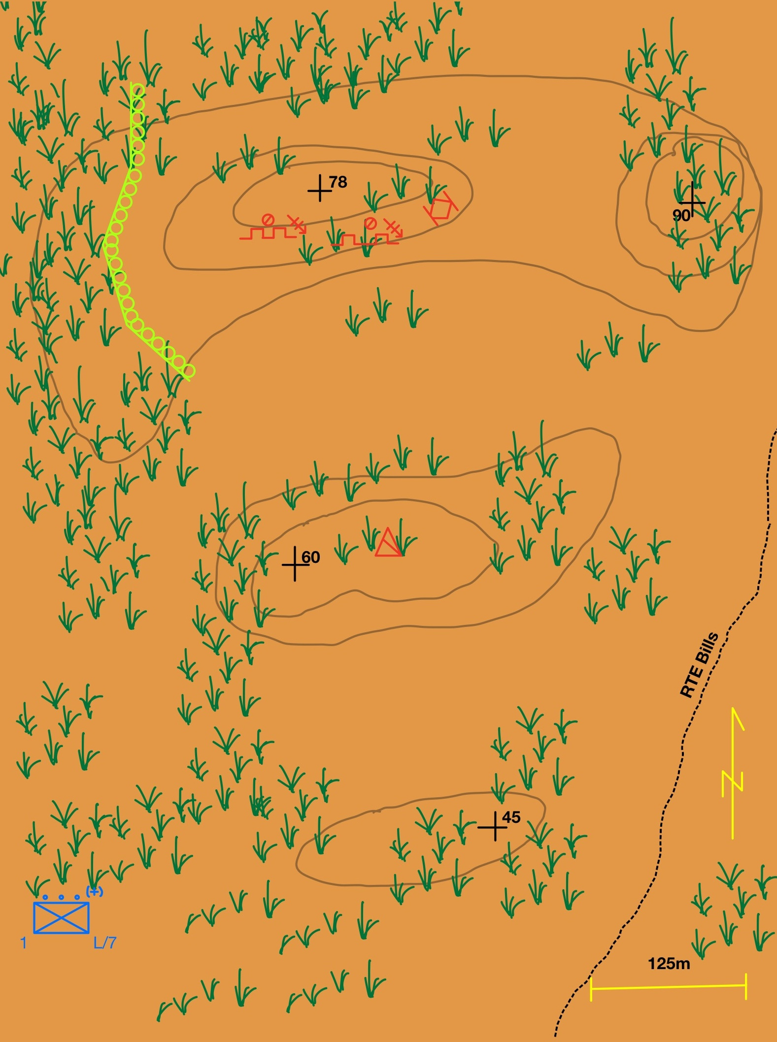 An enemy infantry section with one ZBD-05 has been located establishing a security position on Hill 78. We don’t know where their parent platoon is located, though they are likely spread between several security positions. The section is assessed to be oriented on ROUTE BILLS, an unimproved dirt track capable of supporting vehicle traffic through the rough terrain. Two team sized sandbag/timber fighting positions with medium machine guns have been identified and a likely LP/OP appears to be setting up somewhere on hill 60. Last night, several enemy soldiers were seen stringing a single strand concertina wire obstacle on the West flank of Hill 78. The enemy likely has at least one QLZ-87 grenade launcher but we’re not sure where it is set up. The enemy likely has various small reconnaissance and kamikaze drones. We think the position can likely be reinforced up to a platoon size within thirty minutes if the enemy platoon commander decides to make a stand around Hill 78.