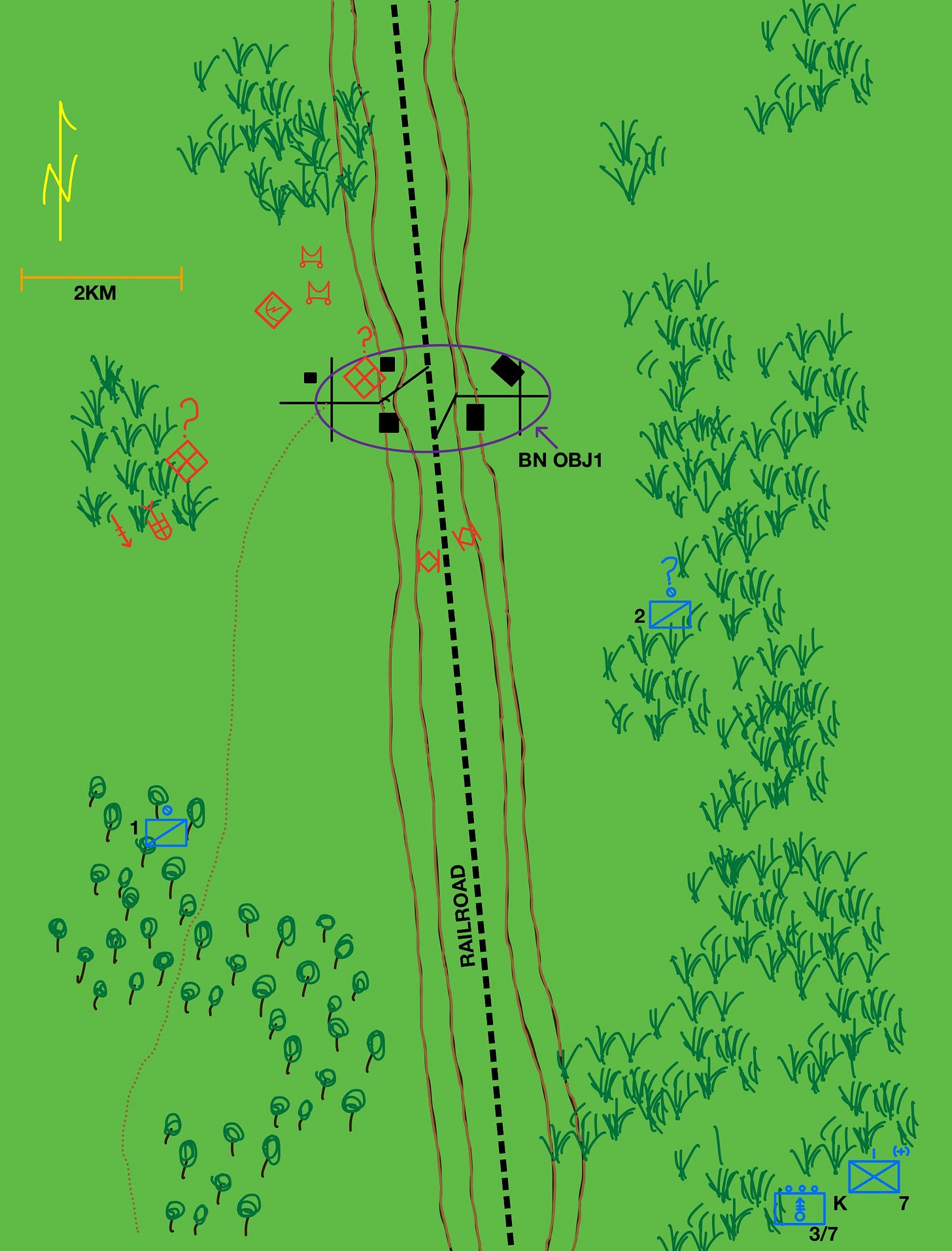 Kilo Company is the far right company of the battalion attack. On your left is India Company (off the map, 4 KM). They are attacking north along one of the disused and severely degraded highways in the Area of Operations (AO). Lima Company is mechanized and in reserve 6 KM to your rear.
